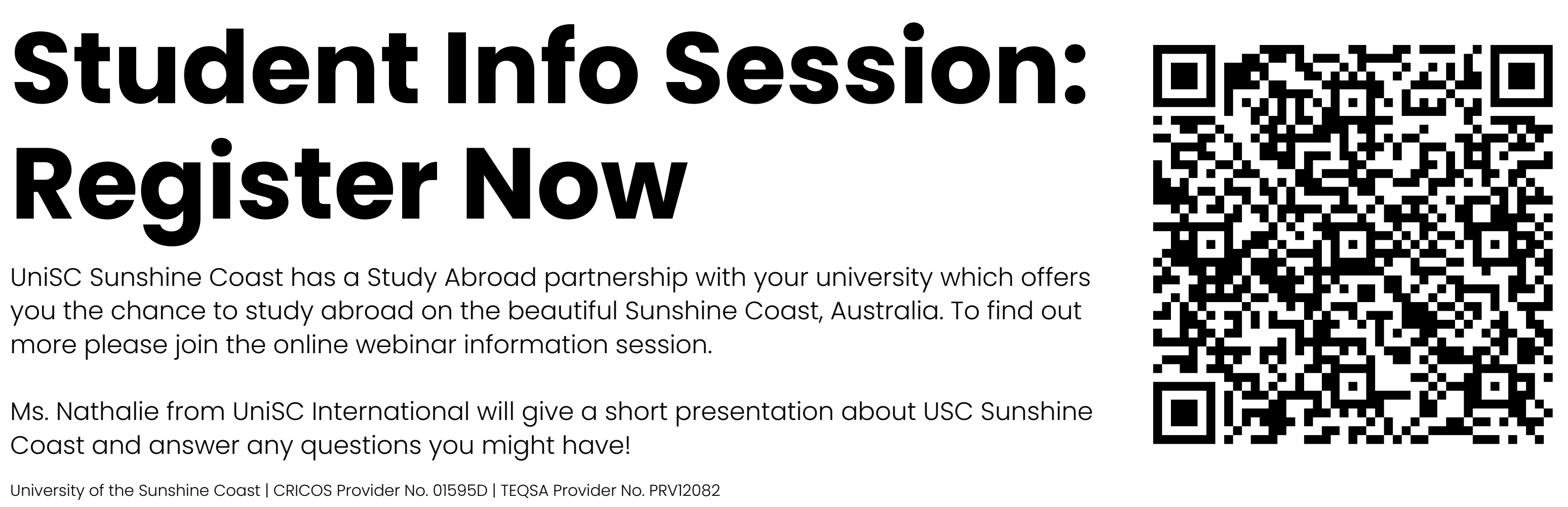 To find out more please join the online webinar information session. Ms. Nathalie Chau from UniSC International will give a short presentation about USC Sunshine Coast and answer any questions you might have!